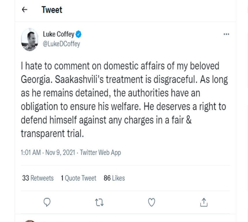 მიხეილ სააკაშვილის მიმართ მოპყრობა სამარცხვინოა, – ამის შესახებ The Heritage Foundation-ის ანალიტიკოსი, ლუკ კოფი სოციალურ ქსელ Twitter-ში წერს.