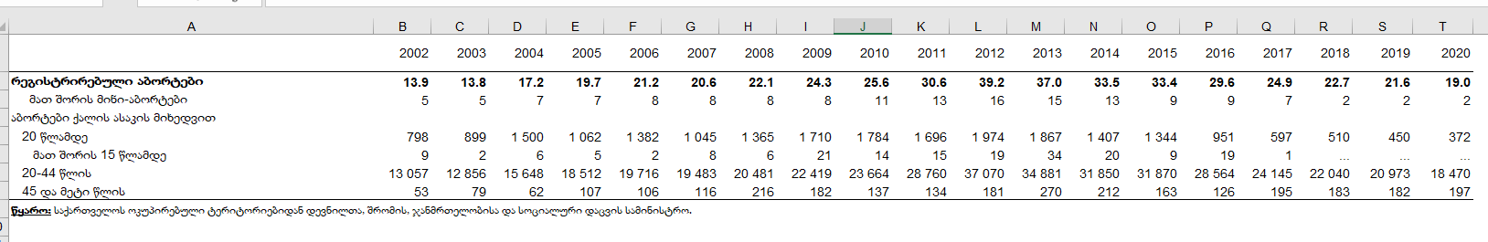 როგორც პუბლიკაციაში მოცემული ინფორმაციიდან ირკვევა, 2020 წელს ქვეყანაში აბორტის 19 000 შემთხვევაა დარეგისტრირებული. ასაკობრივი დაყოფის თანახმად, პროცენტულად, ყველაზე მეტი აბორტი 20-დან 44-წლამდე ქალებში დაფიქსირდა. ამ ასაკობრივ კატეგორიაში 18 470 აბორტი ჩატარდა.