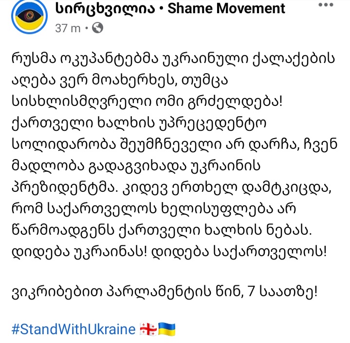 მოძრაობა “სირცხვილია” პარლამენტის წინ, 7 საათზე, უკრაინის მხარდასაჭერად, მოქალაქეების შეკრებას აანონსებს.