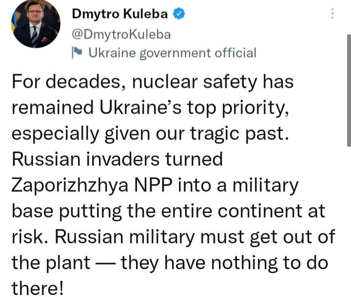 “რუსმა ოკუპანტებმა ზაპოროჟიეს ატომური ელექტროსადგური სამხედრო ბაზად აქციეს, რომელიც საფრთხეს უქმნის მთელ კონტინენტს. რუსი სამხედროები უნდა გავიდნენ ქარხნიდან – მათ იქ არაფერი ესაქმებათ“, – წერს კულება “ტვიტერზე”.