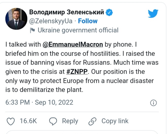 “წამოვაყენე რუსებისთვის სავიზო რეჟიმის აკრძალვის საკითხი. დიდი დრო დავუთმეთ ზაპოროჟიეს ატომურ ელექტროსადგურზე შექმნილ კრიტიკულ ვითარებას. ჩვენი პოზიცია მდგომარეობს იმაში, რომ ევროპის ბირთვული კატასტროფისგან დაცვის ერთადერთი გზა სადგურის დემილიტარიზაციაა“, – წერს ზელენსკი “ტვიტერში”.