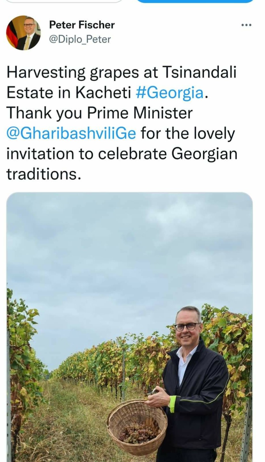 “ვმონაწილეობ რთველში, წინანდლის ისტორიულ ვენახში. მადლობას ვუხდი პრემიერმინისტრ ირაკლი ღარიბაშვილს ქართული ტრადიციების ზეიმში მონაწილეობის მისაღებად მოწვევისთვის”, – წერს გერმანიის ელჩი “ტვიტერში”.