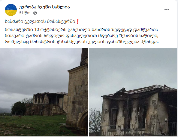 გელათის სამონასტრო კომპლექსის ტერიტორიაზე ხანძარი იყო