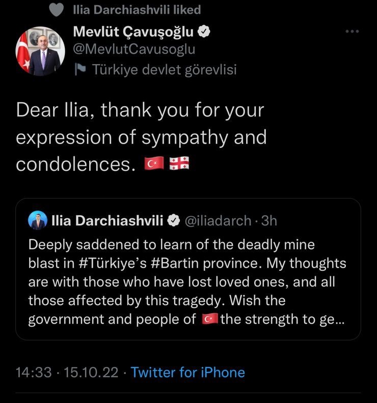 თურქეთის საგარეო საქმეთა მინისტრი, მევლუთ ჩავუშოღლუ, ქართველ კოლეგას, თურქეთის ბართინის პროვინიციაში, ქვანახშირის მაღაროში დატრიალებული ტრაგედიის გამო გამოხატული თანადგომისთვის მადლობას უხდის. ამის შესახებ თურქეთის საგარეო უწყების ხელმძღვანელმა საკუთარ “ტვიტერის” გვერდზე დაწერა, სადაც კოლეგის მიერ გამოხატულ სამძიმარს გამოეხმაურა: