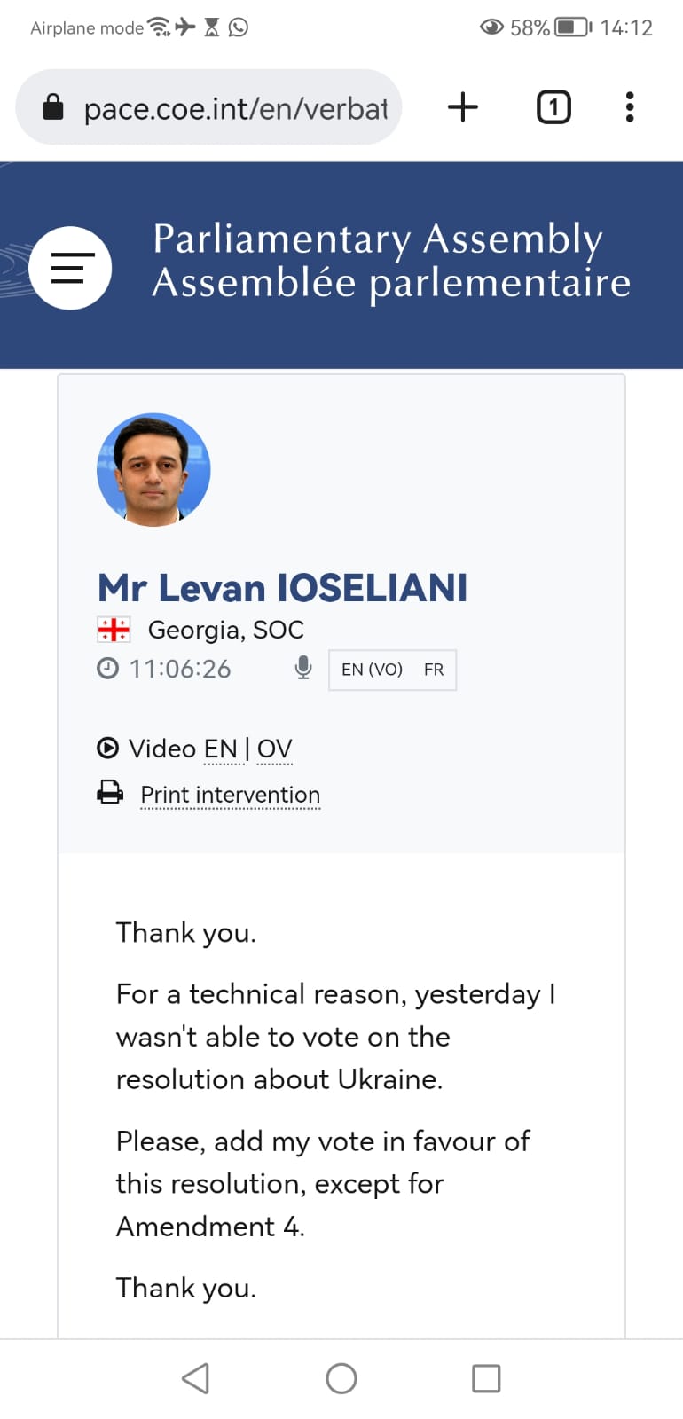 რახან ერთიანი ხმის მიცემის შედეგებში ჩემი ხმა არ ჩანს, ვიღაცებმა ჩათვალეს, რომ რეზოლუციის ტექსტს მხარი არ დავუჭირე. რა თქმა, უნდა ამ ხმის მიცემის ჩამონათვალში, ჩემი ხმა არ გამოჩნდებოდა, იმიტომ რომ თუ გინდა რომ რეზოლუციას, რომელიმე შესწორების გარეშე დაუჭირო მხარი, ამის შესახებ პლენარულ სხდომაზე უნდა განაცხადო ზეპირსიტყვიერად და შემდეგ რეზოლუციის შედეგებს ჩანაწერის სახით აეკრობა შენი მხარდაჭერა.