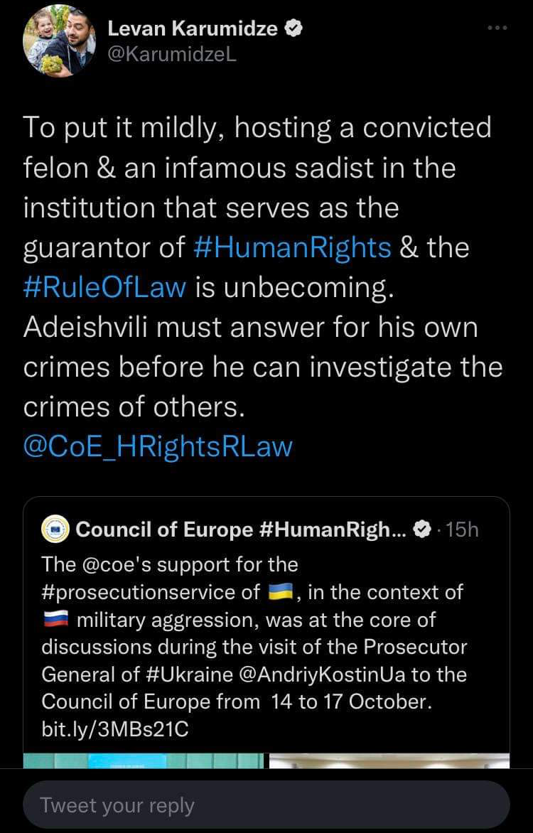 „მსჯავრდებულის და ცნობილი სადისტის მასპინძლობა იმ დაწესებულებაში, რომელიც ადამიანის უფლებებისა და კანონის უზენაესობის გარანტია, რბილად რომ ვთქვათ, შეუფერებელია. ადეიშვილმა ჯერ პასუხი უნდა აგოს საკუთარ დანაშაულებზე, სანამ სხვის დანაშაულებს გამოიძიებს“, – წერს ქარუმიძე.