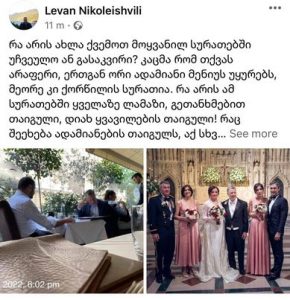 „რა არის ახლა ქვემოთ მოყვანილ სურათებში უჩვეულო ან გასაკვირი? კაცმა რომ თქვას – არაფერი, ერთგან ორი ადამიანი მენიუს უყურებს, მეორე კი ქორწილის სურათია. რა არის ამ სურათებში ყველაზე ლამაზი, გეთანხმებით თაიგული, დიახ ყვავილების თაიგული! რაც შეეხება ადამიანების თაიგულს, აქ სხვა შემთხვევასთან გვაქვს საქმე: ძებნილი, ბრალდებული, ნაცების და მათი ტელევიზიების დამფინანსებელი კეზერაშვილი, “კრიტიკული” მედიის “თვალსაჩინო” წარმომადგენელი ეკა კვესიტაძე და “ჩვენი ამერიკელი მეგობარი” კურტ ვოლკერი! კეზერა და კვესიტაძე კი ვიცით ვინც არიან, ვოლკერზე კი შეგახსენებთ, ეს ის “ყმაწვილია,” რომელსაც დღევანდელი ხელისუფლება არ უყვარს( განსხვავებით წინა ხელისუფლებისა), და საქართველოს ნატო-ში რომ “ექაჩება,” ოღონდ სამაჩაბლოსა და აფხაზეთის გარეშე! ხოდა, ამ ფონზე და ამ სურათებში ყვავილების თაიგული რომ არის ყველაზე ლამაზი, რა გასაკვირია!“, – წერს ნიკოლეიშვილი.