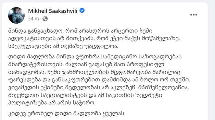 სააკაშვილი აღნიშნავს, რომ კლინიკა “ვივამედის” ექიმები მისი გამოჯანმრთელებისთვის, მცდელობას არ აკლებენ და დასძენს, რომ ამ საკითხის ზედმეტი პოლიტიზება საჭირო არ არის.