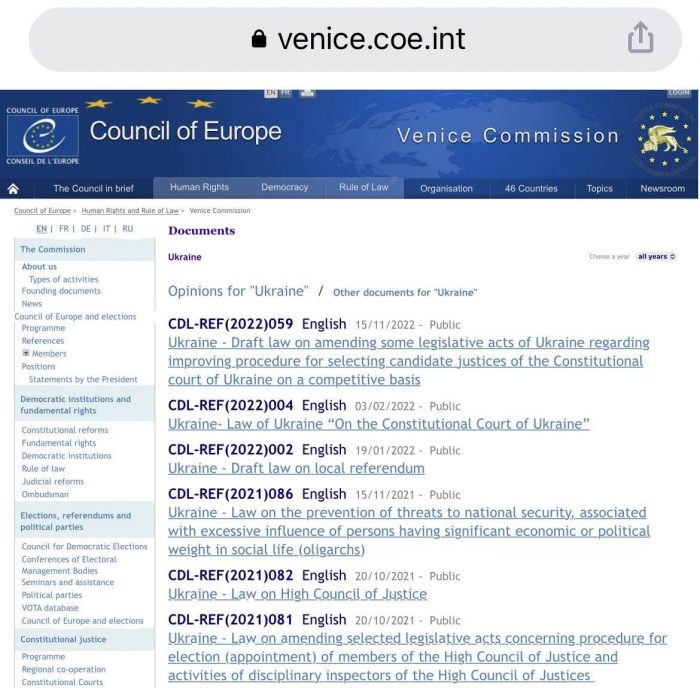 ვენეციის კომისიის ვებგვერდზე უკრაინის მიერ გაგზავნილი კანონი „დეოლიგარქიზაციის შესახებ“ ხელმისაწვდომია