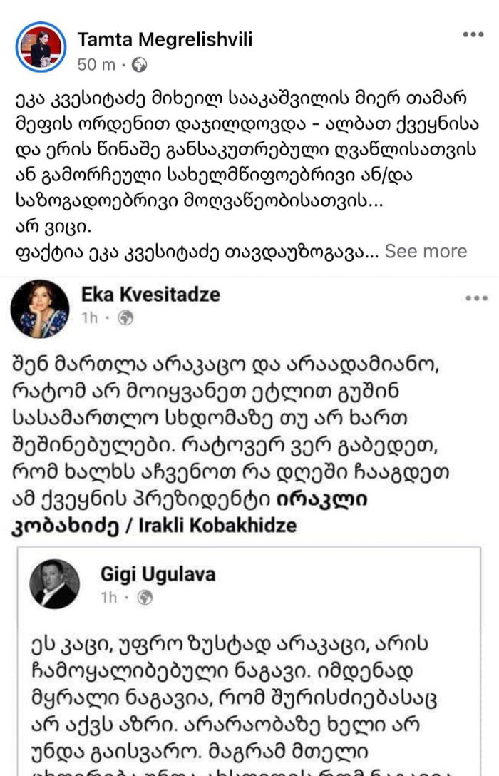 თამთა მეგრელიშვილი: ეკა კვესიტაძე სააკაშვილის მიერ თამარ მეფის ორდენით დაჯილდოვდა, თავდაუზოგავად ამართლებს მიშას ამ დიდ “წყალობას” და ნარატივი “მიშა მაგარია” წლებია, თან გასდევს მის ყოველ გადაცემას