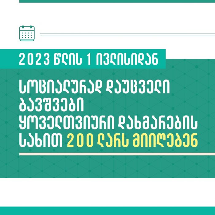 აღსანიშნავია, რომ, დღეის მდგომარეობით, ამ სოციალური გასაცემლით 220 ათასი ბავშვი სარგებლობს. ამ პროგრამის ბიუჯეტი 2023 წელს 465 მილიონი ლარი იქნება, 2024 წელს კი 530 მილიონი ლარი იქნება გათვალისწინებული.