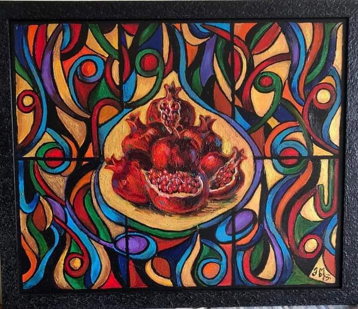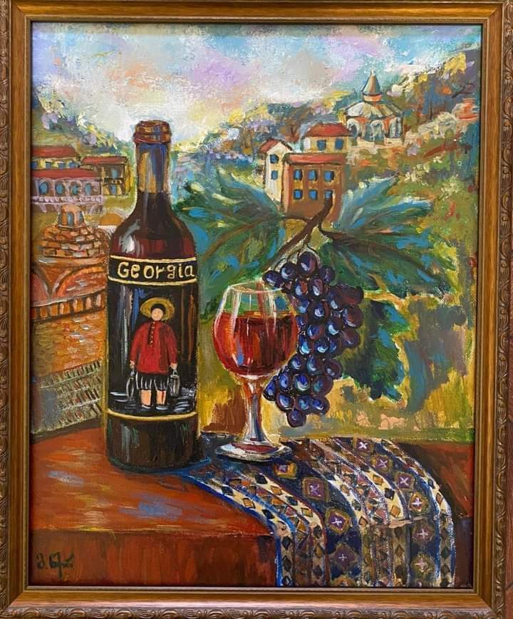 მამაჩემს ჰქონდა დიდი ვენახი საჩხერეში, მიყვარს შავი ყურძენი და მამას სულ ვეხმარებოდი ზაფხულობით. რთველზე ვგიჟდები… დედა აკიდოებს აკეთებდა და ჭერზე ჰკიდებდა ყურძენს. ჰოდა, დავკიდე… ქვევრი დავამატე, ბროწეული მიყვარს და დავდე. ეს დოქი, ჭიქა, ქვევრი ისეა, თითქოს ეტრფიან, ეფერებიან ერთმანეთს, უყვართ ერთმანეთი, დათვრნენ და ეალერსებიან ერთმანეთს… ეს აკრილია, მოსკოვში წაიღო კოლექციონერმა.