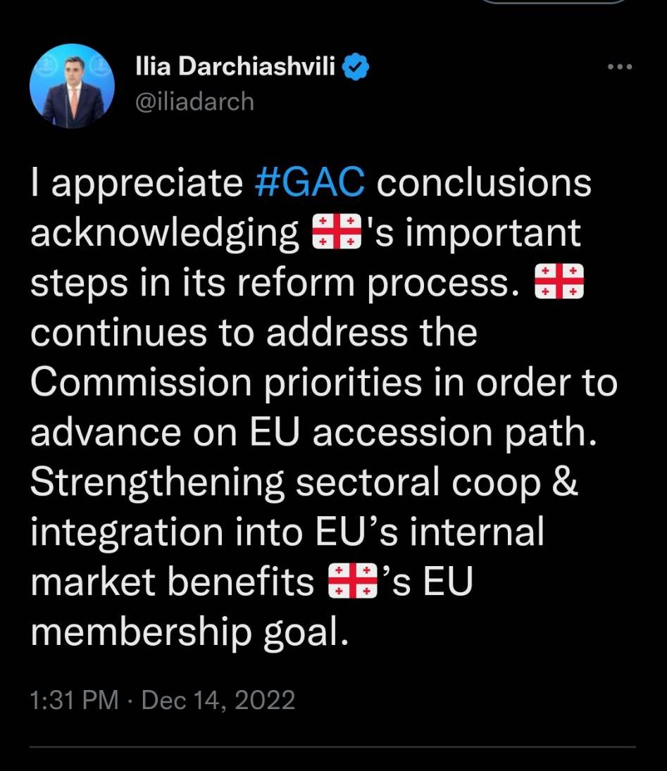 „სექტორული თანამშრომლობის გაძლიერება და ევროკავშირის შიდა ბაზარზე ინტეგრაცია მნიშვნელოვანია საქართველოს ევროკავშირში გაწევრიანებისთვის. გაფართოების პაკეტის ფარგლებში, საქართველოს პროგრესი 2023 წელს შეფასდება“, – წერს დარჩიაშვილი.