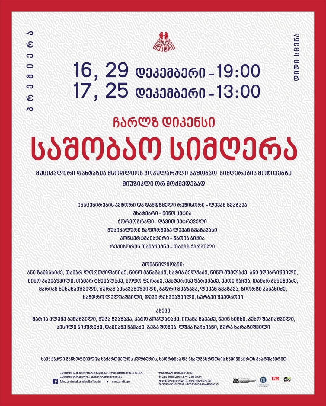 16 დეკემბერს, 19:00 საათზე, ნოდარ დუმბაძის სახელობის მოზარდ მაყურებელთა თეატრში, ჩარლზ დიკენსის ცნობილი ზღაპრის მიხედვით, მიუზიკლ „საშობაო სიმღერის” პრემიერა გაიმართება.