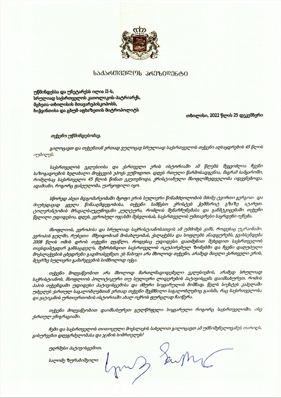 პრეზიდენტი სალომე ზურაბიშვილი სრულიად საქართველოს კათოლიკოს-პატრიარქს, ილია მეორეს აღსაყდრებიდან 45-ე წლისთავს ულოცავს.
