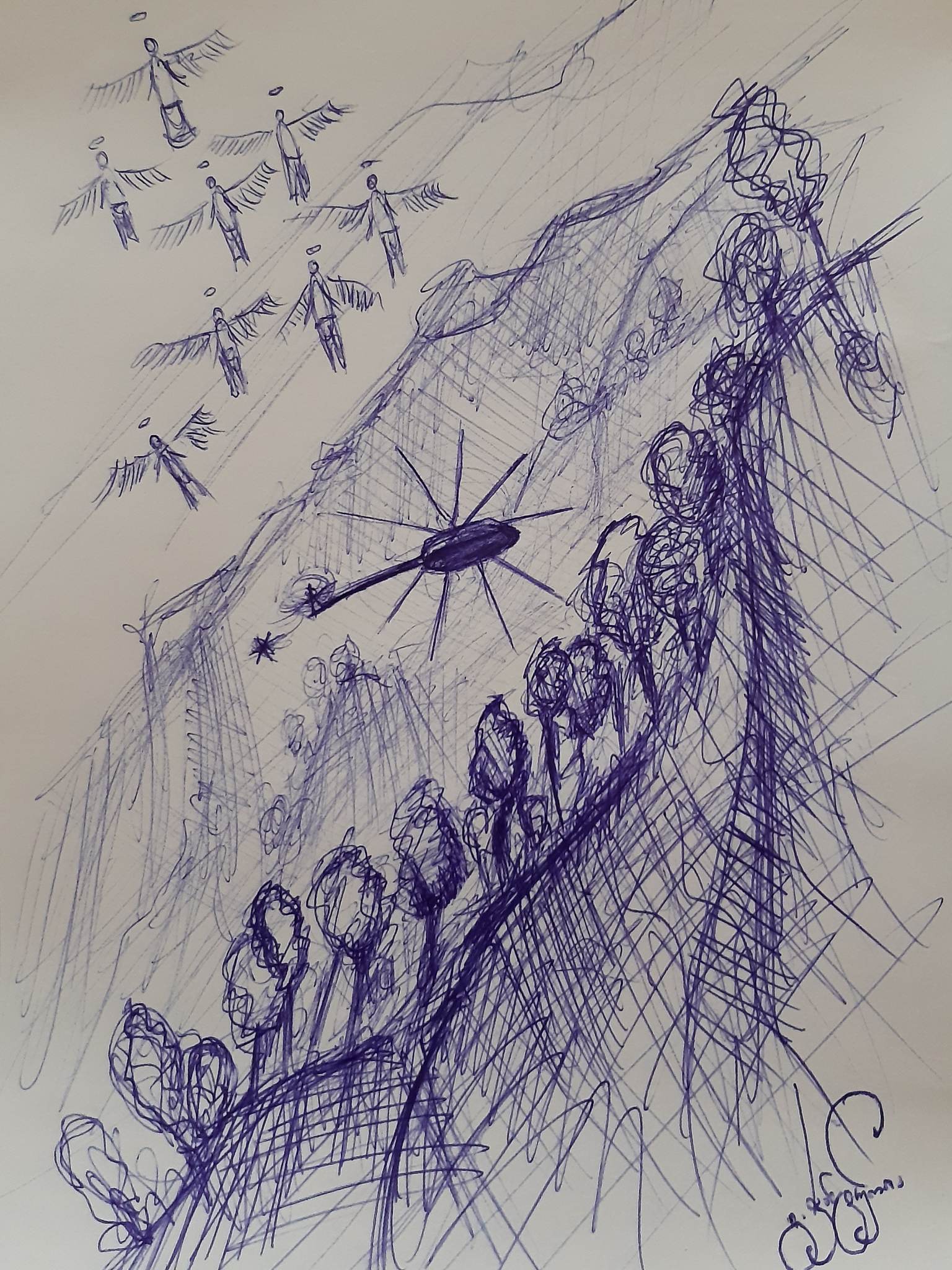– გეთანხმებით, ეს ჩანახატი მაშინვე დავხატე. ვფიქრობ,  როცა ადამიანები სხვისი სიცოცხლის გადასარჩენად მიდიან და ამ დროს თვითონ ეწირებიან, ღმერთი არ დაუშვებს, რომ მათ ტკივილი აგრძნობინოს.