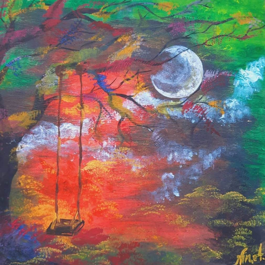 ერთ საღამოს რამდენიმე ფერის ძველი აკრილის საღებავი ვიპოვე, ტილოს პოვნა კი ადვილი არ იყო. რამდენიმეწუთიანი ფიქრის შემდეგ ბებოს უზარმაზარი სამზარეულოს დაფა მოვპარე, რომელსაც რამდენიმე წუთის წინ იყენებდა, ნახატის უკანა მხარეს დღემდე ატყვია ფქვილის კვალი. ნახატის დასრულებამდე დანაშაული არ მიღიარებია. როცა ვაღიარე, უკვე დაგვიანებული იყო…