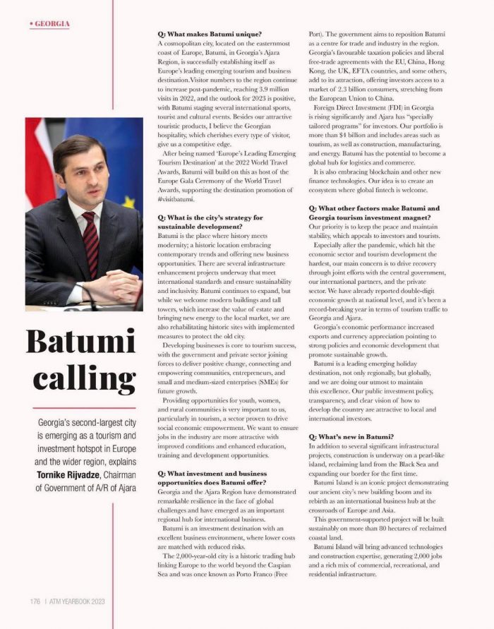 თუ რატომ ბათუმი, აჭარის მთავრობის თავმჯდომარის თორნიკე რიჟვაძის ATM Yearbook 2023-ში გამოქვეყნებულ ინტერვიუში ნათქვამია, რომ ბათუმი დამსახურებულად ატარებს ევროპის სწრაფად მზარდი ტურისტული და ბიზნეს მიმართულების სტატუსს და ის ოთხივე სეზონზე მიმზიდველია თავისი უნიკალური კულტურით, ტრადციებით, ხელშეუხებელი მწვანე ბუნებითა და მშვენიერი ზღვის სანპიროთი.