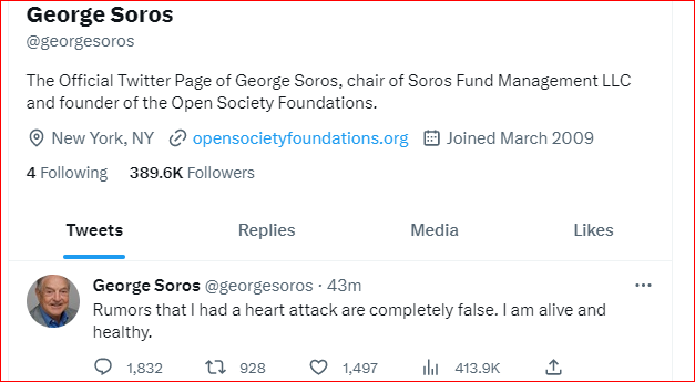 “გავრცელებული ხმები, რომ გულის შეტევა მქონდა, სრული სიცრუეა. ცოცხალი ვარ და კარგად ვარ”, – წერს ჯორჯ სოროსი.