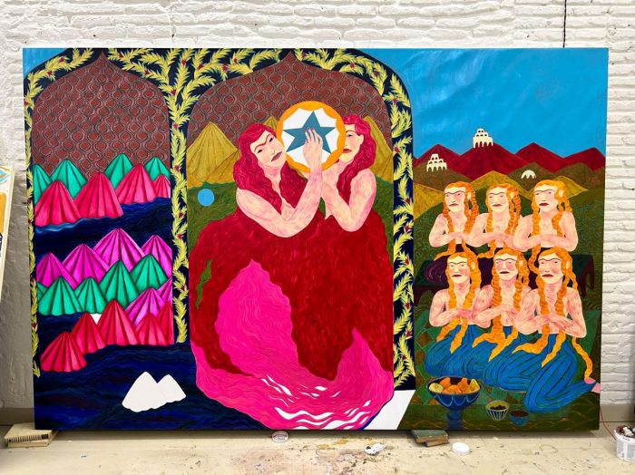 „ორი თვე მოვანდომე მსოფლიოს ისტორიაში ყველაზე პირველი ფემინისტი ქალის ფერწერულ ამეტყველებას, ჩემი ტილო წარსულის, აწმყოს და პირობითი მომავლის სამ აქტს ასახავს, იგი შევასრულე სპარსული ხალიჩის სტილიზაციაში. სურათის ცენტრალური ნაწილი ასახავს მედეს აწმყოს, მის გაორმაგებულ, გაძლიერებული ფიგურას, რომელიც სრულიად არის დაფარული საკუთარი თმით – ულევი ძალით და სიბრძნით”, – ასე აღწერს მხატვარი თავის დამოკიდებულებას მედეას მომნუსხველი, შემაძრწუნებელი, საკამათო და ძლევამოსილი მითის მიმართ.