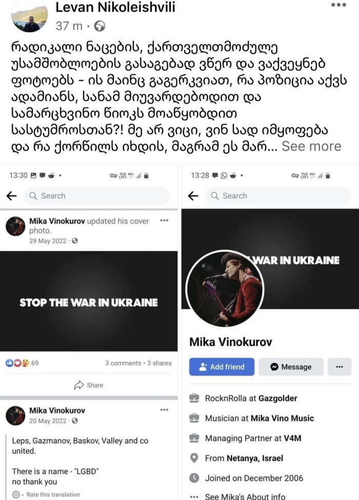ექსპერტი ლევან ნიკოლეიშვილი სოციალურ ქსელში სასტუმრო „ყვარლის ტბასთან“ მომხდარ აქციას ეხმიანება. ნიკოლეიშვილი რადიკალი ნაცების, ქართველთმოძულე უსამშობლოების გასაგებად წერს და აქვეყნებს მიკა ვინოკუროვის მიერ უკრაინის მხარდასაჭერ ე.წ. სქრინებს, რომელიც აპროტესტებს რუსეთის ფედერაციის მიერ უკრაინაში შეჭრის ფაქტს.