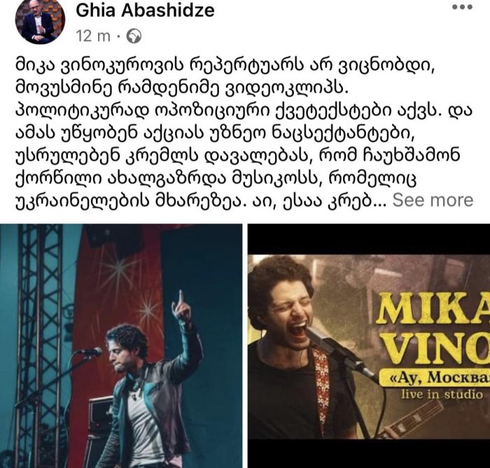 „მიკა ვინოკურის რეპერტუარს არ ვიცნობდი, მოვუსმინე რამდენიმე ვიდეოკლიპს. პოლიტიკურად ოპოზიციური ქვეტექსტები აქვს.“- წერს ანალიტიკოსი გია აბაშიძე სოციალურ ქსელში, რითაც რუსი მუსიკოსის, ისრაელის მოქალაქის, მიკა ვინოკუროვის საქართველოში სტუმრობას და მისი ქორწილის ირგვლივ განვითარებულ მოვლენებს ეხმიანება.