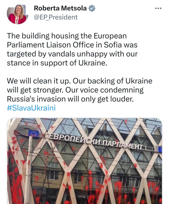„ბულგარეთის დედაქალაქ სოფიაში შენობა, სადაც განთავსებულია ევროპარლამენტის ოფისი, ვანდალების სამიზნე გახდა ადამიანებისგან, რომლებიც უკმაყოფილო არიან უკრაინის მიმართ ჩვენი პოზიციით. უკრაინის მიმართ ჩვენი მხარდაჭერა გაძლიერდება. ჩვენი ხმა, რომელიც გმობს რუსეთის უკრაინაში შეჭრას, უფრო ხმამაღალი იქნება“, – წერს ევროპარლამენტის პრეზიდენტი.