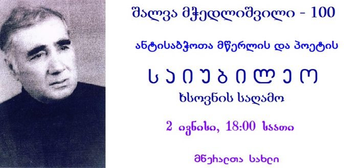 2 ივნისს, 18:00 საათზე, საქართველოს მწერალთა სახლში, პოეტისა და მწერლის, შალვა მჭედლიშვილის საიუბილეო ხსოვნის საღამო გაიმართება. მას წელს 100 წელი შეუსრულდებოდა.