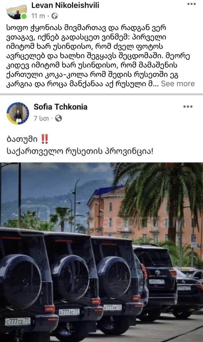 ლევან ნიკოლეიშვილი – სოფო ჭყონიას: უსინდისო ხარ ძველ ფოტოებს ავრცელებ და ხალხი შეგყავს შეცდომაში – მამაშენის ქართული „კოკა-კოლა“ რუსეთში რომ შედის ეგ კარგია და როცა მანქანაა აქ რუსული მაშინ ვართ პროვინცია?