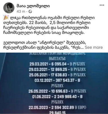„ლяკა რюბლოვნას ოჯახში რუსული რუბლი თუხთუხებს. 22 მაისს, 2,5 მილიონი რუბლი ჩაურიცხეს რუსეთიდან და საქართველოში ჩამომსვლელი რუსების სიაც მოაყოლეს.