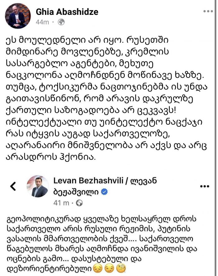 „ეს მოულედნელი არ იყო. რუსეთში მიმდინარე მოვლენებზე, კრემლის სასარგებლო აგენტები, მეხუთე ნაცკოლონა აღმოჩნდნენ მოწინავე ხაზზე. თუმცა, ტოქსიკურმა ნაცთოჯინებმა ის უნდა გაითვალისწინონ, რომ არავის დაკრულზე ქართული საზოგადოება არ ცეკვავს! ინტელექტუალი თუ უინტელექტო ნაცქაჯი რას იტყვის აუგად საქართველოზე, აღარანაირი მნიშვნელობა არ აქვს და არც არასდროს ჰქონია”, – წერს აბაშიძე facebook – ზე.