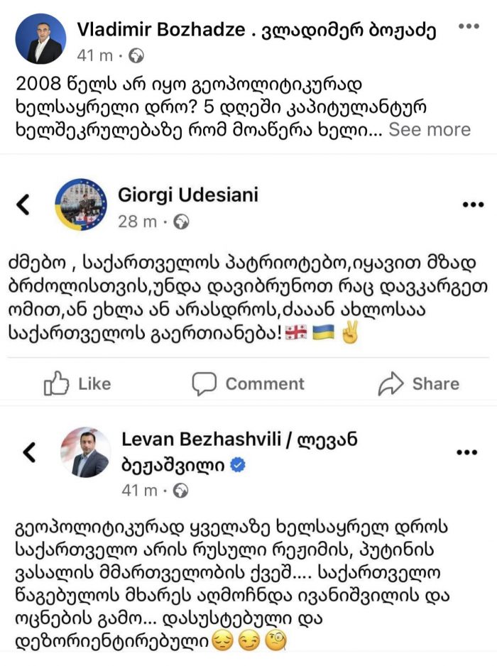 “2008 წელს არ იყო გეოპოლიტიკურად ხელსაყრელი დრო? 5 დღეში კაპიტულანტურ ხელშეკრულებაზე რომ მოაწერა ხელი ჰალსტუხიჭამიამ? რატომ მიატოვეთ ცოცხალი, დაჭრილი და გარდაცვლილი ჩვენი გმირი ჯარისკაცები?”, – ასე ეხმიანება თბილისის საკრებულოს წევრი ვლადიმერ ბოჟაძე საქართველოს კულტურის, ძეგლთა დაცვისა და სპორტის მინისტრის ყოფილი მოადგილის, გიორგი უდესიანის facebook სტატუსს, რომელშიც უდესიანი აცხადებს, რომ „ ძმებო, საქართველოს პატრიოტებო, იყავით მზად ბრძოლისთვის, უნდა დავიბრუნოთ რაც დავკარგეთ ომით, ან ახლა ან არასდროს, ძალიან ახლოსაა საქართველოს გაერთიანება!“