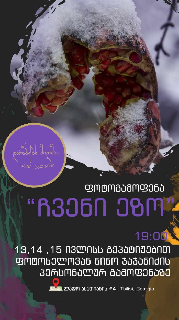 13 ივლისს, 19:00 საათზე, კაფე-სალონში „დარაბებს მიღმა” ნინო ჯაჯანიძის პირველი პერსონალური ფოტოგამოფენა „ჩვენი ეზო“ გაიხსნება.