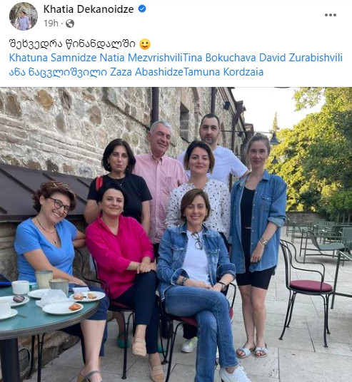 ოპოზიციური პარტიების წარმომადგენლები წინანდალში შეხვედრაზე იმყოფებიან. არაფორმალურ გარემოში გადაღებული საერთო ფოტო კახეთიდან, პოლიტიკური ჯგუფის „ევროოპტიმისტები“ წევრმა ხატია დეკანოიძემ სოციალურ ქსელში გაავრცელა აღწერით – „შეხვედრა წინანდალში“.