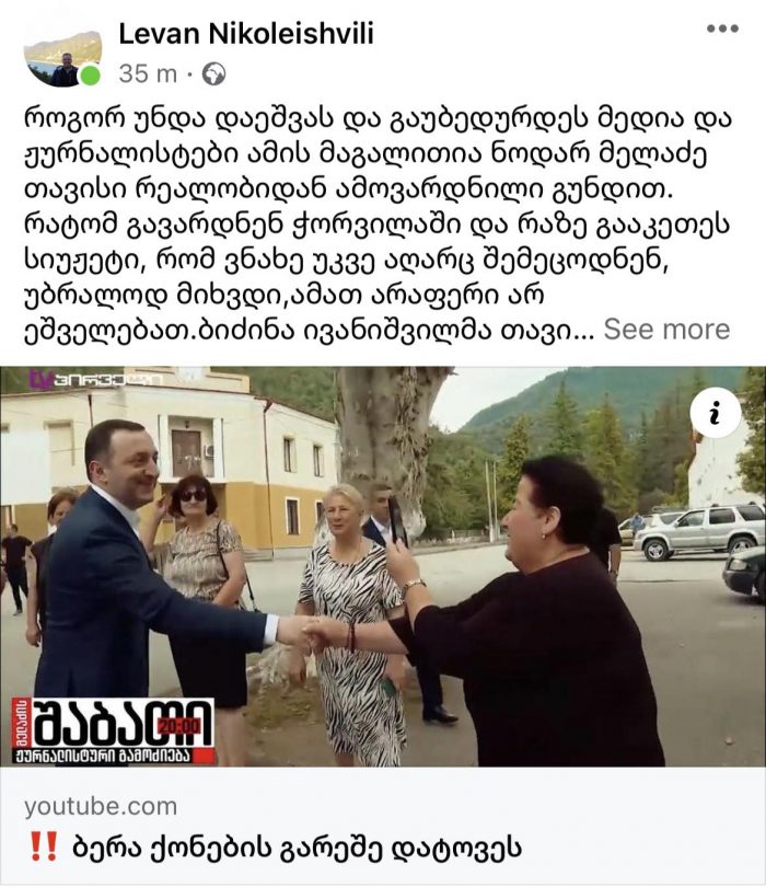 “როგორ უნდა დაეშვას და გაუბედურდეს მედია და ჟურნალისტები ამის მაგალითია ნოდარ მელაძე თავისი რეალობიდან ამოვარდნილი გუნდით. რატომ გავარდნენ ჭორვილაში და რაზე გააკეთეს სიუჟეტი, რომ ვნახე უკვე აღარც შემეცოდნენ, უბრალოდ მიხვდი, ამათ არაფერი არ ეშველებათ. ბიძინა ივანიშვილმა თავისი ქონება ეკატერინე ხვედელიძეს გადაუფორმა და ბერა ივანიშვილი ქონების გარეშე დატოვაოო. ჯერ ერთი ივანიშვილი საკუთარ მეუღლეს და შვილებს რას მისცემს ვის რა საქმეა და მეორეც ამაზე მნიშნელოვანი საქმე არ გაქვთ? თუმცა რას იზამ ეს არის ყვითელი პრესაც და მედიაც, რეალურადაც ასეთი “სკანდალებით” იკვებებიან. ჩვენი მეგობარი უცხოელები რას იტვყვიან, “მაგარი ინფორმაცია” მიიღეს “კრიტიკული მედიიდან” თუ ისევ ვერ გაამართლეს?“- წერს ლევან ნიკოლეიშვილი სოციალურ ქსელში.