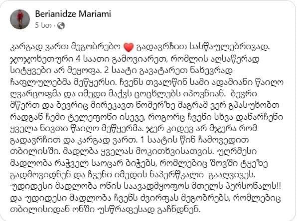 „2 საათი გავატარეთ ნახევრად ჩაფლულებმა მეწყერში. ჩვენ თვალწინ სამი ადამიანი წაიღო ღვარცოფმა და იმედი მაქვს, ცოცხლებს იპოვნიან. ბევრი მწერთ და ბევრიც მირეკავთ ნომერზე, მაგრამ ვერ გპასუხობთ, რადგან ჩემი ტელეფონი – ისევე, როგორც ჩვენი სხვა დანარჩენი ყველა ნივთი, წაიღო მეწყერმა. ჯერ კიდევ არ მჯერა, რომ გადავრჩით და კარგად ვართ.