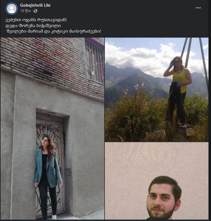 როგორც სოციალურ ქსელში წერენ, “იძებნება ნატო ჭელიძე 3 შვილთან: ლუკა, ანდრია, ანასტასია დუდაშვილებითან ერთად”, ასევე, “ზაზა მესხი მეუღლესა და სამ მცირეწლოვან ბავშვთან ერთად”.