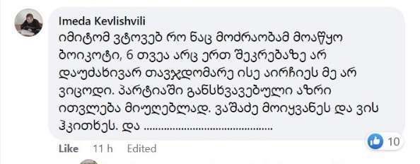 იმიტომ ვტოვებ, რომ “ნაც მოძრაობამ” მოაწყო ბოიკოტი, 6 თვეა, არცერთ შეკრებაზე არ დაუძახივარ თავმჯდომარე ისე აირჩიეს მე არ ვიცოდი. პარტიაში განსხვავებული აზრი ითვლება მიუღებლად. ვაშაძე მოიყვანეს და ვის ჰკითხეს”, – წერს იმედა კევლიშვილი Facebook -ზე.