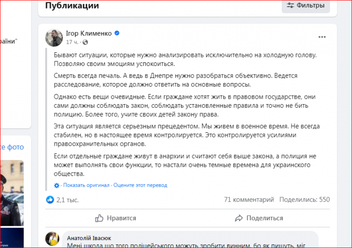 თუ ცალკეული მოქალაქეები ანარქიაში ცხოვრობენ და თავს კანონზე მაღლა მიიჩნევენ და პოლიცია ვერ ასრულებს თავის ფუნქციას, მაშინ უკრაინის საზოგადოებისთვის ძალიან ბნელი დრო დადგა”, – დაწერა მინისტრმა.