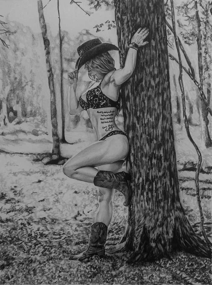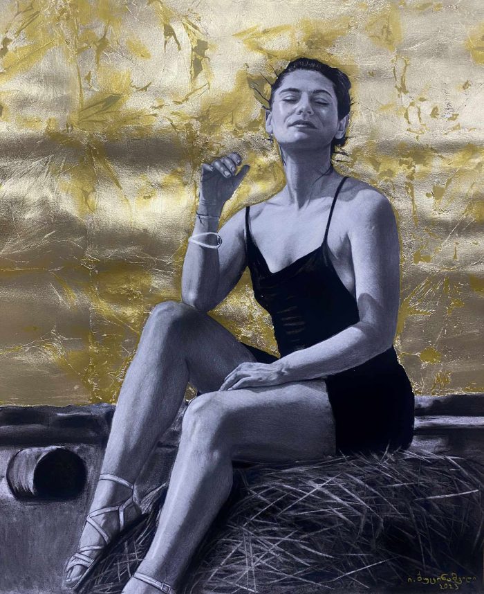 – ფიტნეს გოგონას სილუეტი, ძლიერი შიშველი ქალი, რომელიც ზურგით ზის, შეტრიალებულია მომავლისკენ, სრულიად დაუცველი, არ აქვს ტანისამოსი, არანაირი აბჯარი და იარაღი, თუმცა თავად არის ის ძალა, რომლითაც განაგრძობს ცხოვრებას ღირსეულად. აქვს ვექტორი მიწიდან ცისკენ, ზემოთ ატყორცნილი ხელები და მიწასთან ნაზი შეხება. ეს ნამუშევარი, სხვათა შორის, საკმაოდ დიდი ზომის გახლავთ, ამ მასშტაბზე აქამდე ნახშირით არ მიმუშავია და, ამ გამოცდილების შემდეგ, აუცილებლად გავაგრძელებ დიდი ზომის ნახშირის ხაზს.