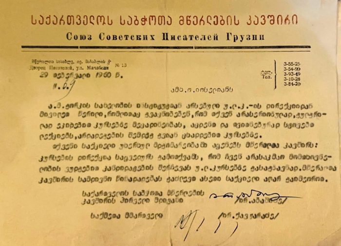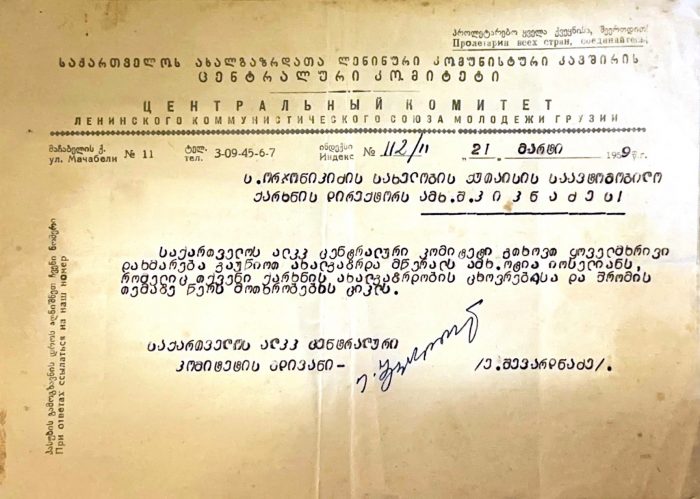 დ.ი. – საბჭოთა ნომენკლატურა ოტიას გადაბირებას სხვადასხვა ხერხით ცდილობდა. გაჩვენებთ შევარდნაძის მიერ ხელმოწერილ დოკუმენტს, სადაც პირდაპირ არის მოთხოვნა, რომ იმ დროისთვის ახალგაზრდა მწერალი, რომელიც ქუთაისის ავტოქარხანაში იყო მივლენილი, მისთვის მაქსიმალური ხელშეწყობა უნდა აღმოეჩინათ.