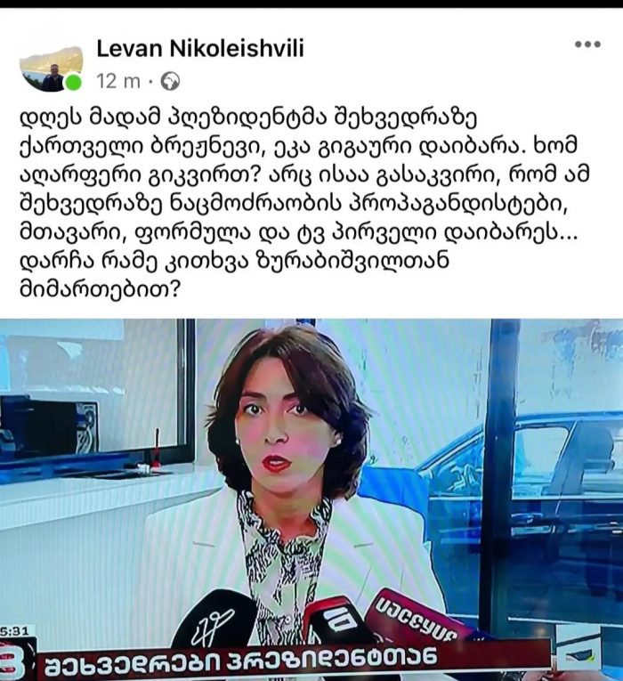 „დღეს მადამ პღეზიდენტმა შეხვედრაზე ქართველი ბრეჟნევი, ეკა გიგაური დაიბარა. ხომ აღარაფერი გიკვირთ? არც ისაა გასაკვირი, რომ ამ შეხვედრაზე ნაცმოძრაობის პროპაგანდისტები, მთავარი, ფორმულა და ტვ პირველი დაიბარეს… დარჩა რამე კითხვა ზურაბიშვილთან მიმართებით?“, – წერს ლევან ნიკოლეიშვილი.