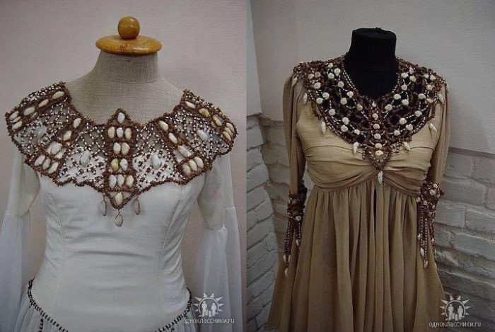 ყველა მოდელს თავისი შესაფერისი ყელსაბამი გავუკეთე. რადგან იმ დროს ფიზიკურად მძივები არ იყიდებოდა, ისინიც ვაშლის კურკებით და ნიჟარებით იყო დამზადებული.