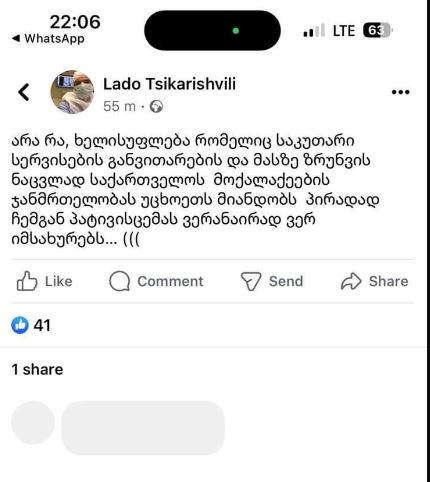 “არა, რა, ხელისუფლება, რომელიც საკუთარი სერვისების განვითარების და მასზე ზრუნვის ნაცვლად საქართველოს ჯანმრთელობას უცხოეთს მიანდობს, პირადად ჩემგან პატივისცემას ვერასდროს დაიმსახურებს”, – დაწერა წიქარიშვილმა სოციალურ ქსელში.