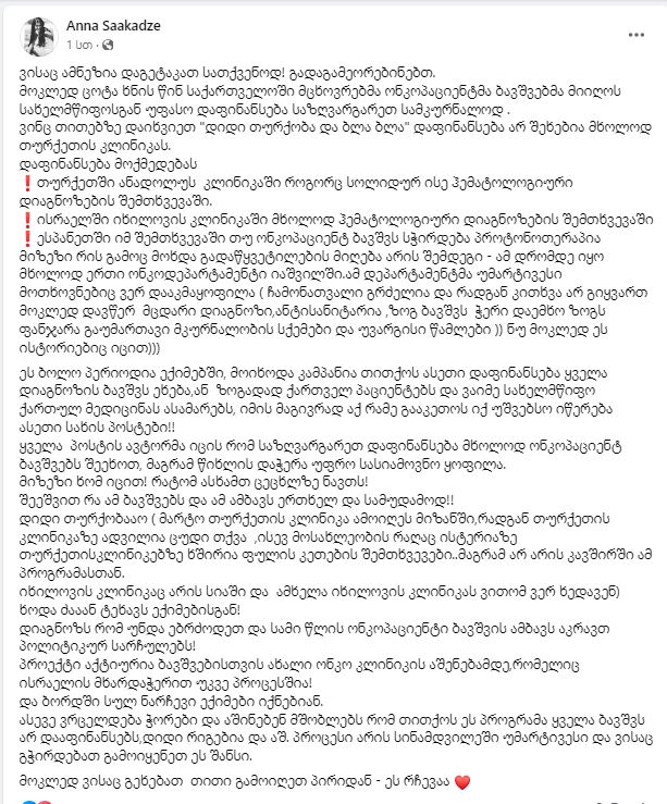 ბოლო დროს რამდენიმე ექიმის წამოწყებულ კამპანიას, რომელიც ონკოლოგიური დიაგნოზის მქონე ბავშვების საზღვარგარეთ მკურნალობის დაფინანსებას ეხება, ანნა სააკაძე სოციალურ ქსელში ეხმაურება.