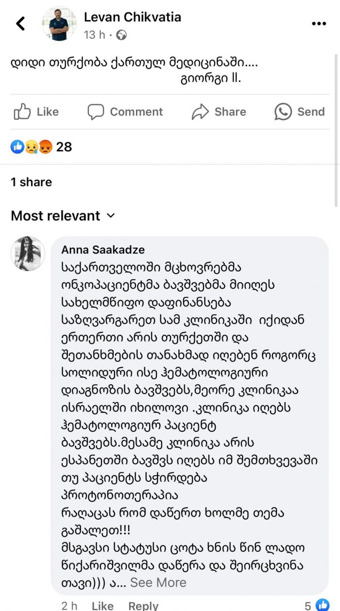 აღნიშნული პოსტებით მედიკოსები სახელმწიფოს მიერ ონკოლოგიური დიაგნოზის მქონე ბავშვების საზღვარგარეთ კლინიკებში მკურნალობის დაფინანსების პროგრამას გამოეხმაურნენ.