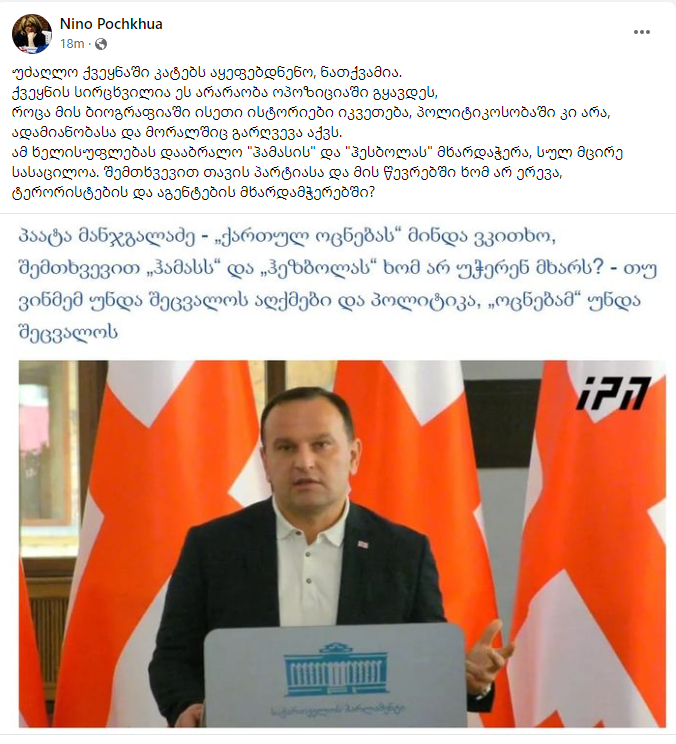 „როცა მის ბიოგრაფიაში ისეთი ისტორიები იკვეთება, პოლიტიკოსობაში კი არა, ადამიანობასა და მორალშიც გარღვევა აქვს. ამ ხელისუფლებას დააბრალო “ჰამასის” და “ჰეზბოლას” მხარდაჭერა, სულ მცირე, სასაცილოა“, – წერს ექსპერტი, ნინო ფოჩხუა „სტრატეგია აღმაშენებლის“ დეპუტატის, პაატა მანჯგალაძის შესახებ, რითაც მის განცხადებას გამოეხმაურა.