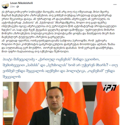 „ეს ტრაგიკომიკური სუბიექტი მაოცებს, თან არც თუ ისე იშვიათად. მისი მცირე, მაგრამ მავნებლური აზროვნებით, თუ ვინმემ თუნდაც სრულიად ლეგიტიმურად ერთი შეკითხვა დასვა, ან უბრალოდ არ დაეთანხმა ამერიკელს ან ევროპელს, ის ავტომატურად „ჰამასის“ ან „ჰესბოლას“ მხარდამჭერია, ხოლო თუ ცალ ფეხზე იხტუნებ იგივე ამერიკელისა თუ ევროპელის წინ ავტომატურად პროდასავლელი ხდები? აი, სად აქვს ჩვენ ქვეყანას ყველაზე დიდი გამოწვევა- უცხოელების მიმართ მონური აზროვნების პოლიტიკოსების პოლიტიკაში ყოფნა და მასმედიის მიერ მათ მავნებლურ-ტუტუცური აზრების გავრცელება.