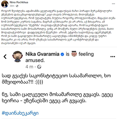 როგორ შეიძლება ადამიანმა ყველაფერს გადაუსვას ხაზი პირადი მერკანტილური ვნებების დასაკმაყოფილებლად? კაცი თავის პროფესიას, მით უმეტეს იურისპრუდენციას, რომ უღალატებს, ნულია როგორც პროფესიონალი, მსგავსი თემა ხომ პირველი კურსის საგანია, მაგრამ აქ მთავარი ეს არ არის, აქ მთავარია, ამ იურისპრუდენციის “მეტრმა” თავისდაუნებურად აღიარა, რომ საკონსტიტუციო სასამართლოს სამი მოსამართლე, ვინც არ მოაწერა ხელი პრეზიდენტის ქეისს, მათი მოღალატეობრივი დაჯგუფების წევრები არიან – ასე ეხმაურება ექსპერტი ნინო ფოჩხუა „მთავარი არხის“ ყოფილი ხელმძღვანელის, ნიკა გვარამიას განცხადებას.