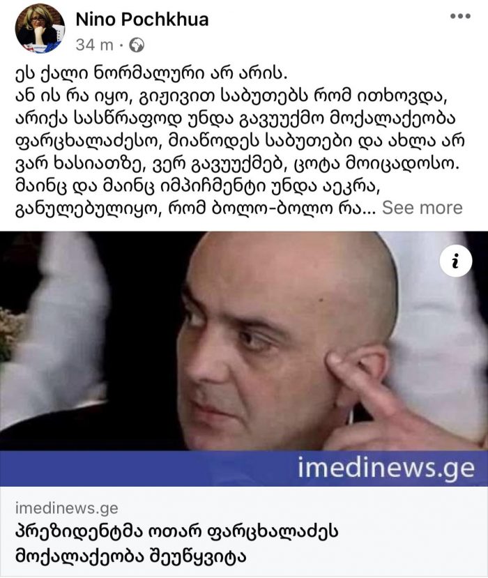 „ან ის რა იყო, გიჟივით საბუთებს რომ ითხოვდა, არიქა სასწრაფოდ უნდა გავუუქმო მოქალაქეობა ფარცხალაძესო, მიაწოდეს საბუთები და ახლა არ ვარ ხასიათზე, ვერ გავუუქმებ, ცოტა მოიცადოსო“, – ექსპერტი ნინო ფოჩხუა მედიაში გავრცელებულ ინფორმაციას სოციალურ ქსელში გამოეხმაურა, რომლის თანახმადაც, პრეზიდენტმა სალომე ზურაბიშვილმა ოთარ ფარცხალაძეს საქართველოს მოქალაქეობა შეუწყვიტა.